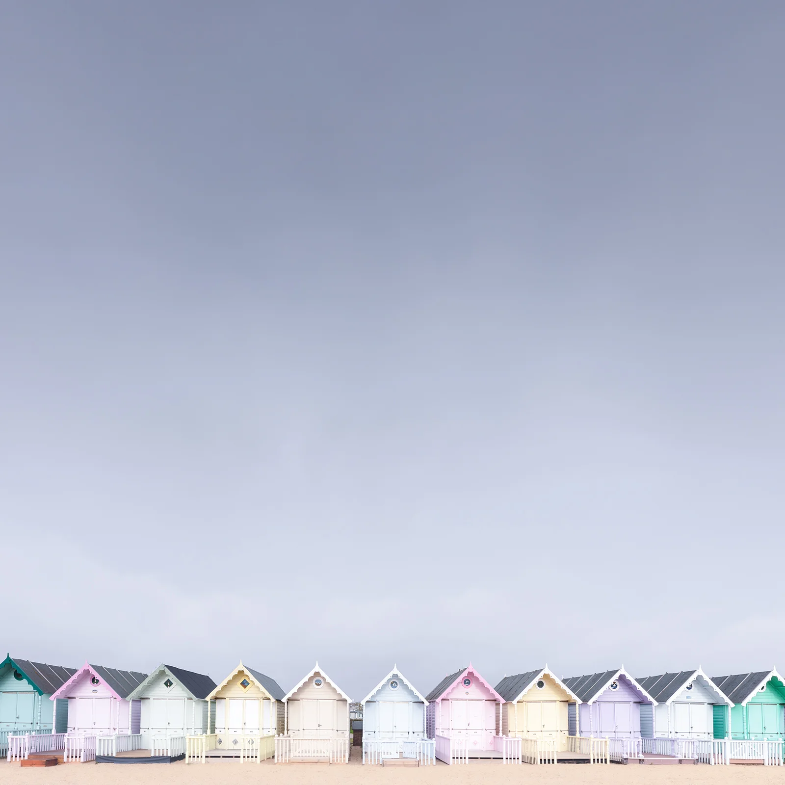 The beautiful pastels of the coordinated beach huts at West Mersea Beach, Essex.