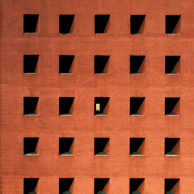 The facade of the cube-ossuary of the cemetery of San Cataldo in Modena: a single passage of light, a single passage between two worlds.