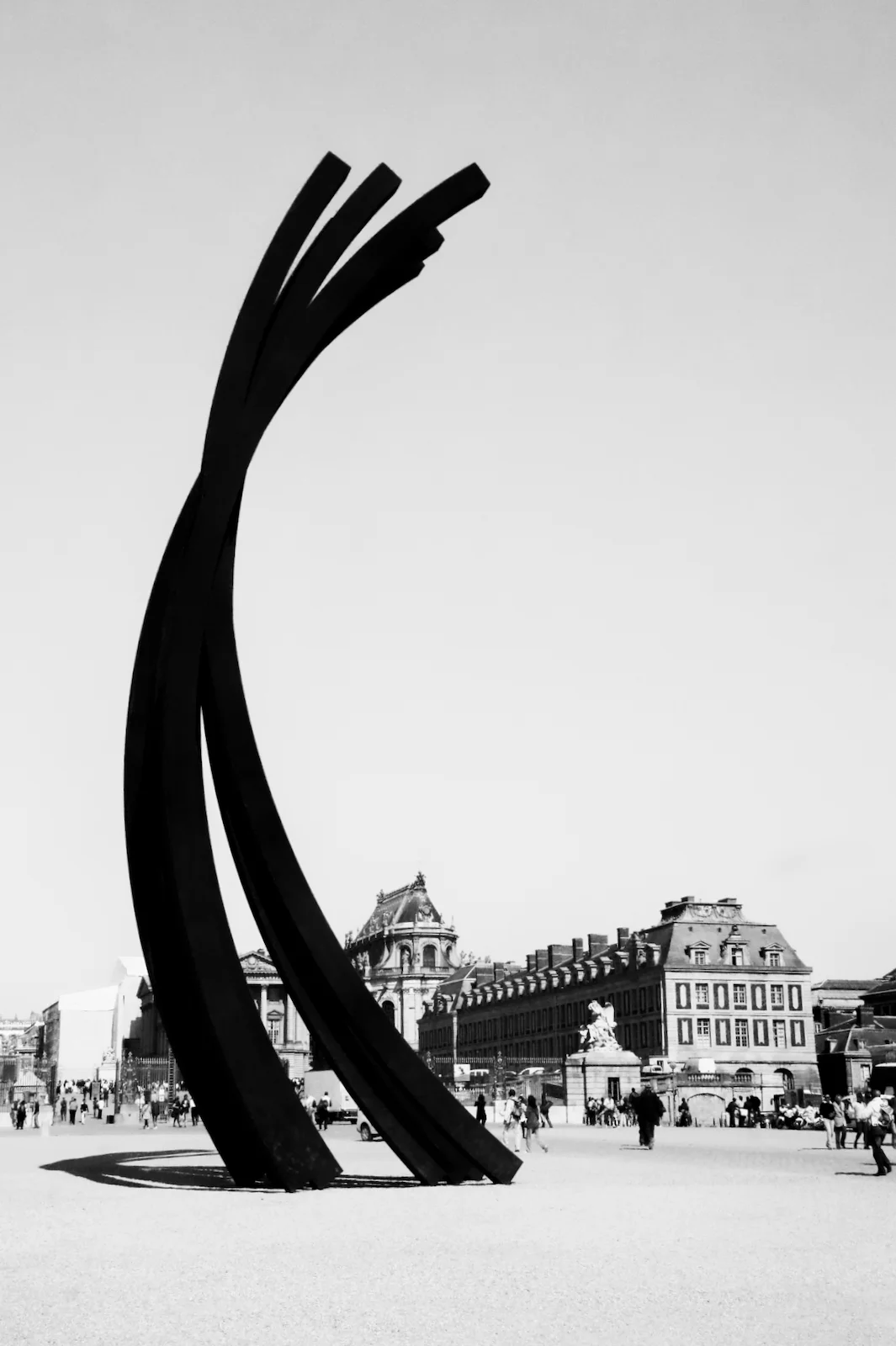 This image was taken ih June 2011 while approaching the Palace from the train station in Versailles. Converting it to black and white makes for an interesting photo that simplifies and emphasizes the huge modern sculpture towering over the classical buildings in the distance.