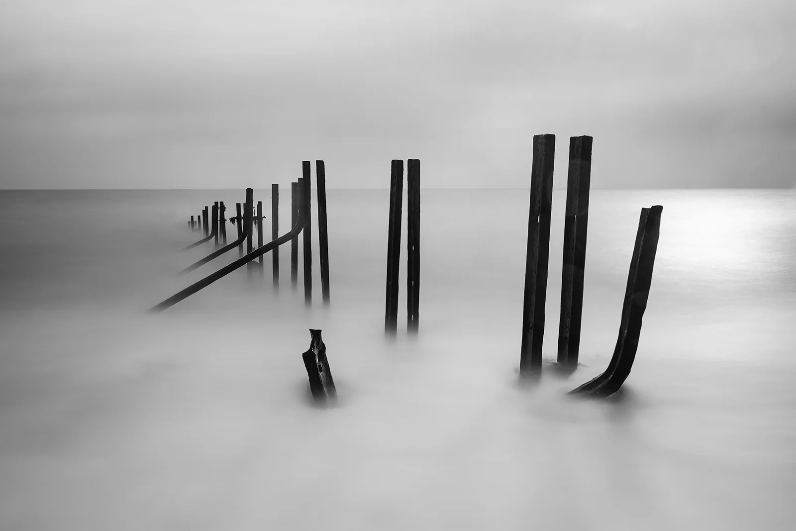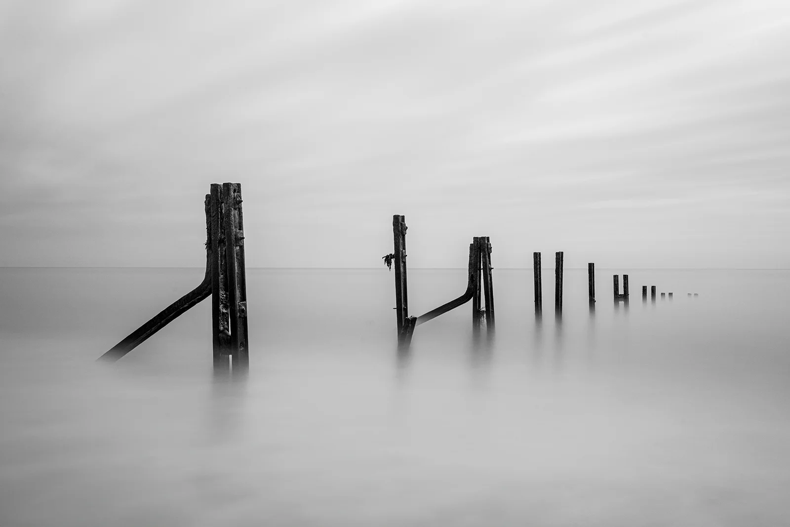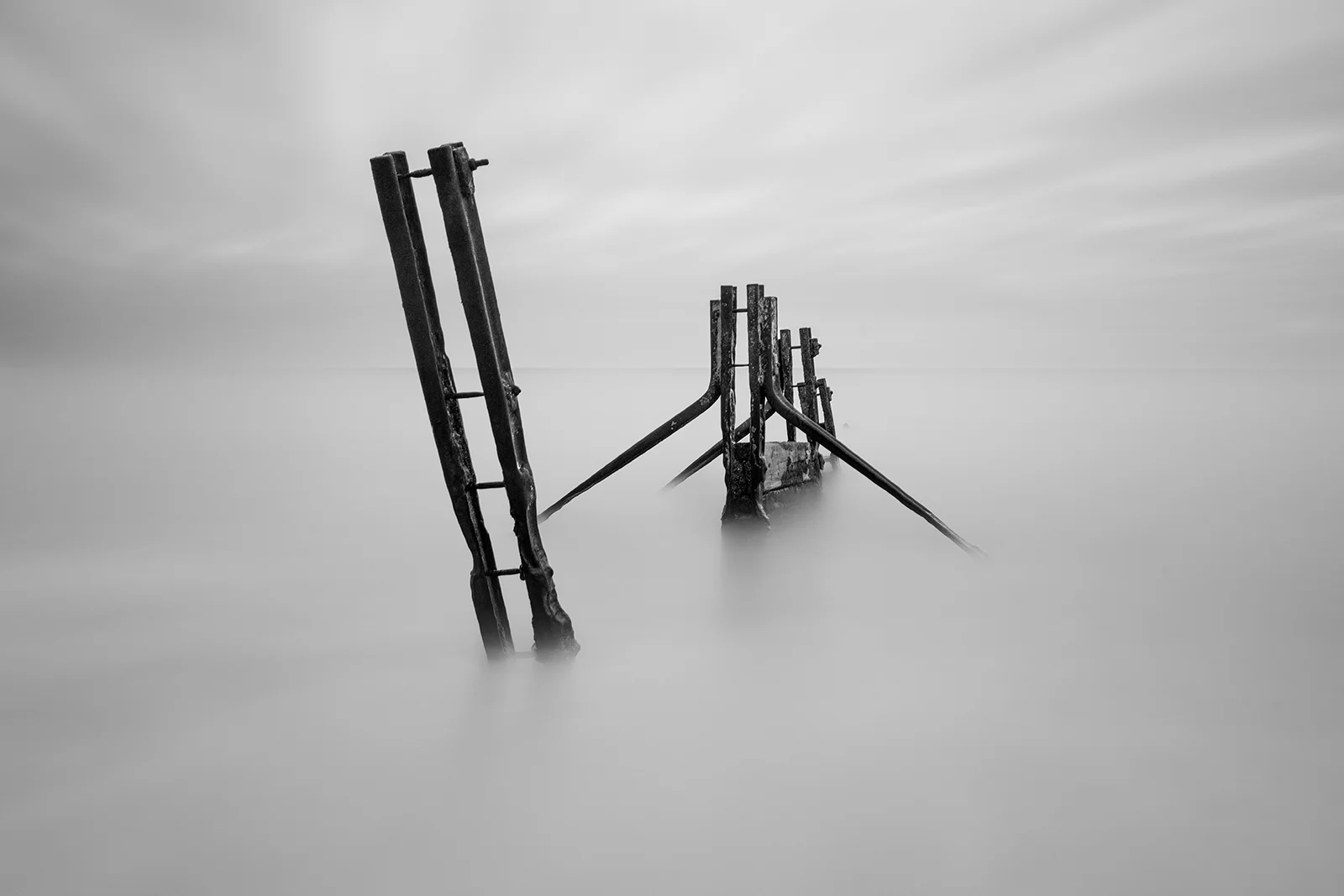 The long exposure images taken at the Warrens in Folkestone, Kent, capture the haunting remnants of the old sea defences as they gradually dissolve into the sea. These ghostly structures, once built to protect the coastline, now stand as silent sentinels, fading into the misty horizon. Shot at exposures ranging from 2 to 4 minutes over different weeks, where tides lap gently at the eroding metal and wood, the images evoke a poignant sense of loss and the inevitable passage of time, a reminder of nature quietly reclaiming back what was once hers.