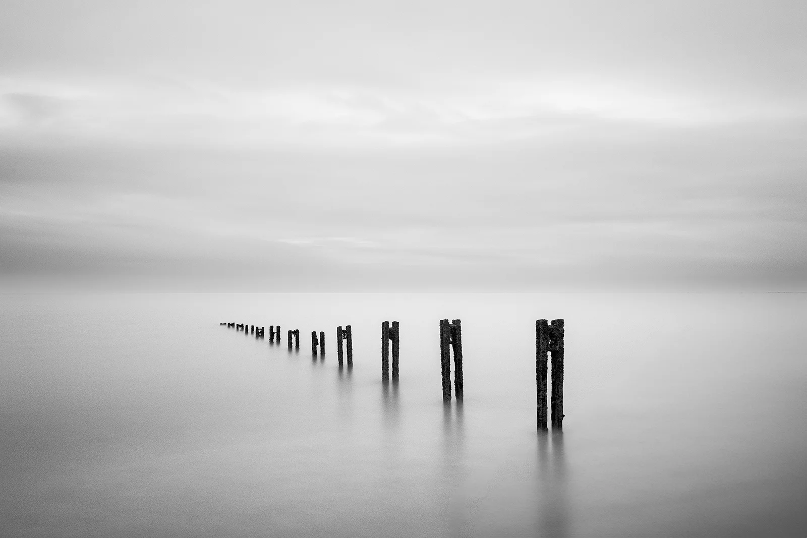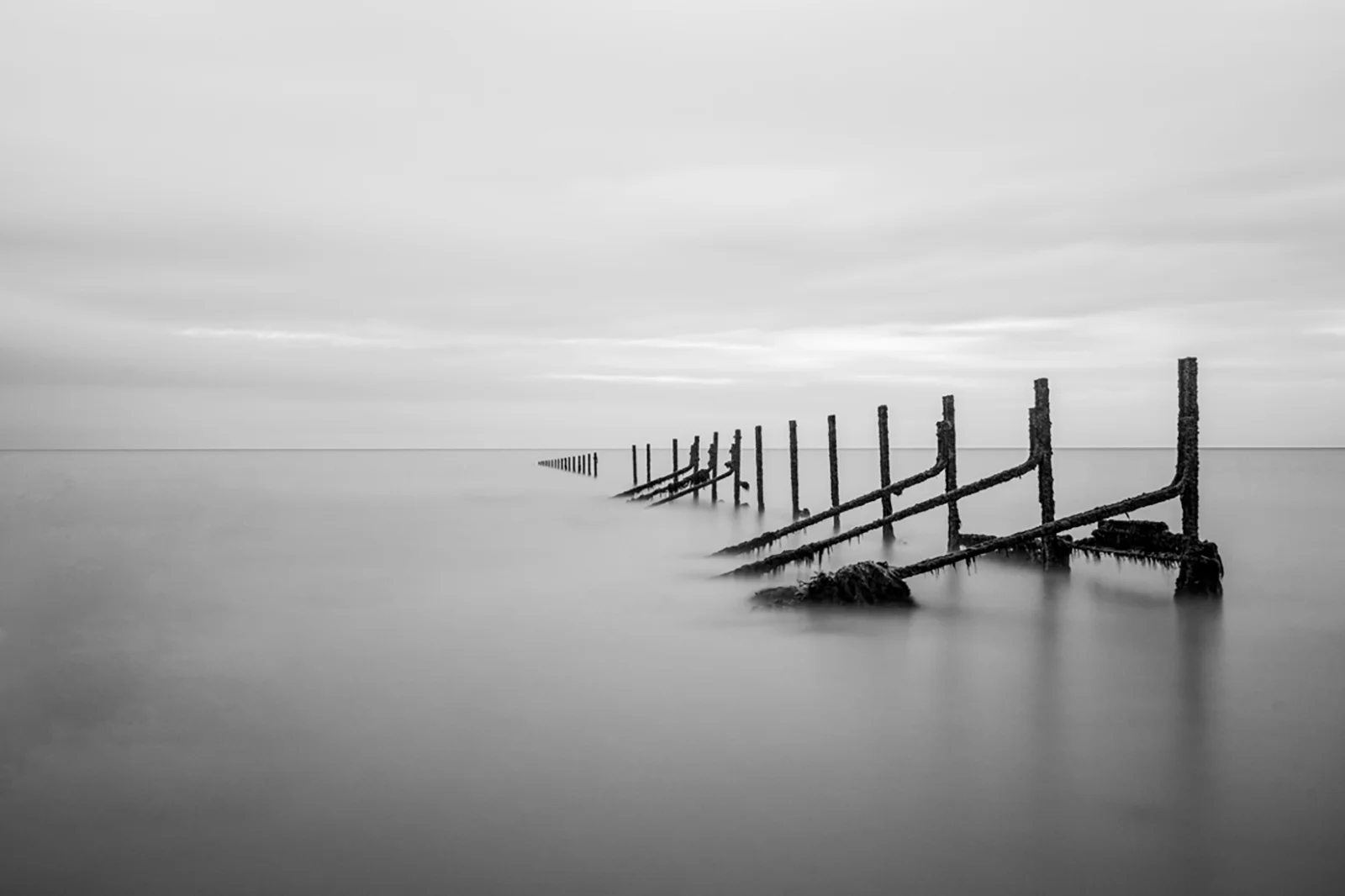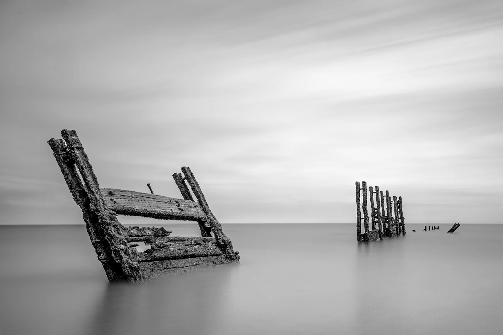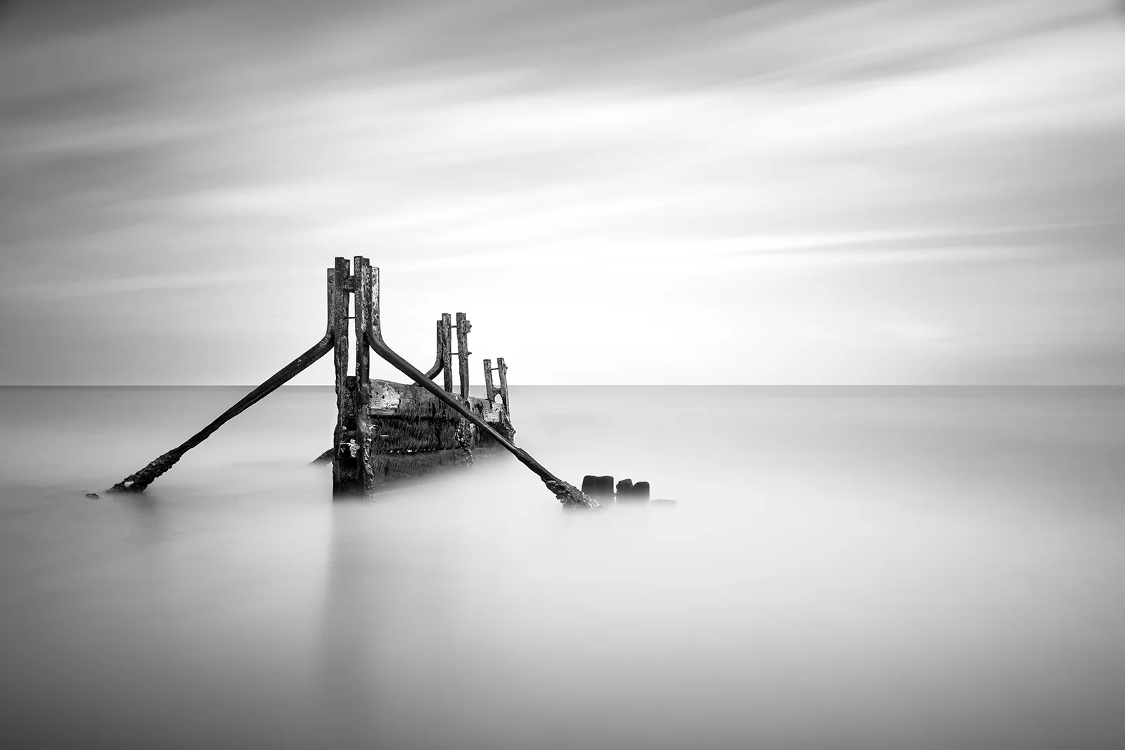 The long exposure images taken at the Warrens in Folkestone, Kent, capture the haunting remnants of the old sea defences as they gradually dissolve into the sea. These ghostly structures, once built to protect the coastline, now stand as silent sentinels, fading into the misty horizon. Shot at exposures ranging from 2 to 4 minutes over different weeks, where tides lap gently at the eroding metal and wood, the images evoke a poignant sense of loss and the inevitable passage of time, a reminder of nature quietly reclaiming back what was once hers.