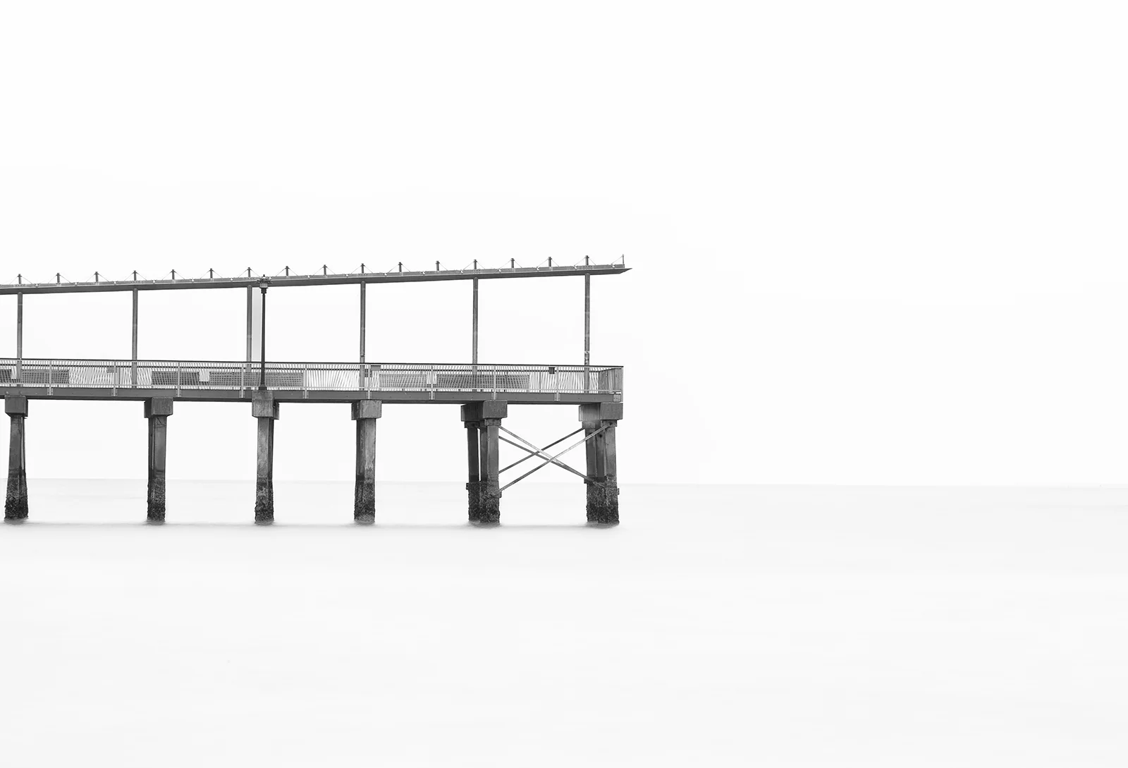 A twenty second exposure captures the right arm of the Steeple Chase Pier extending into a calm, open sea with an overcast sky above. The minimalist composition emphasizes simplicity and solitude. Coney Island Beach, Brooklyn, NY.