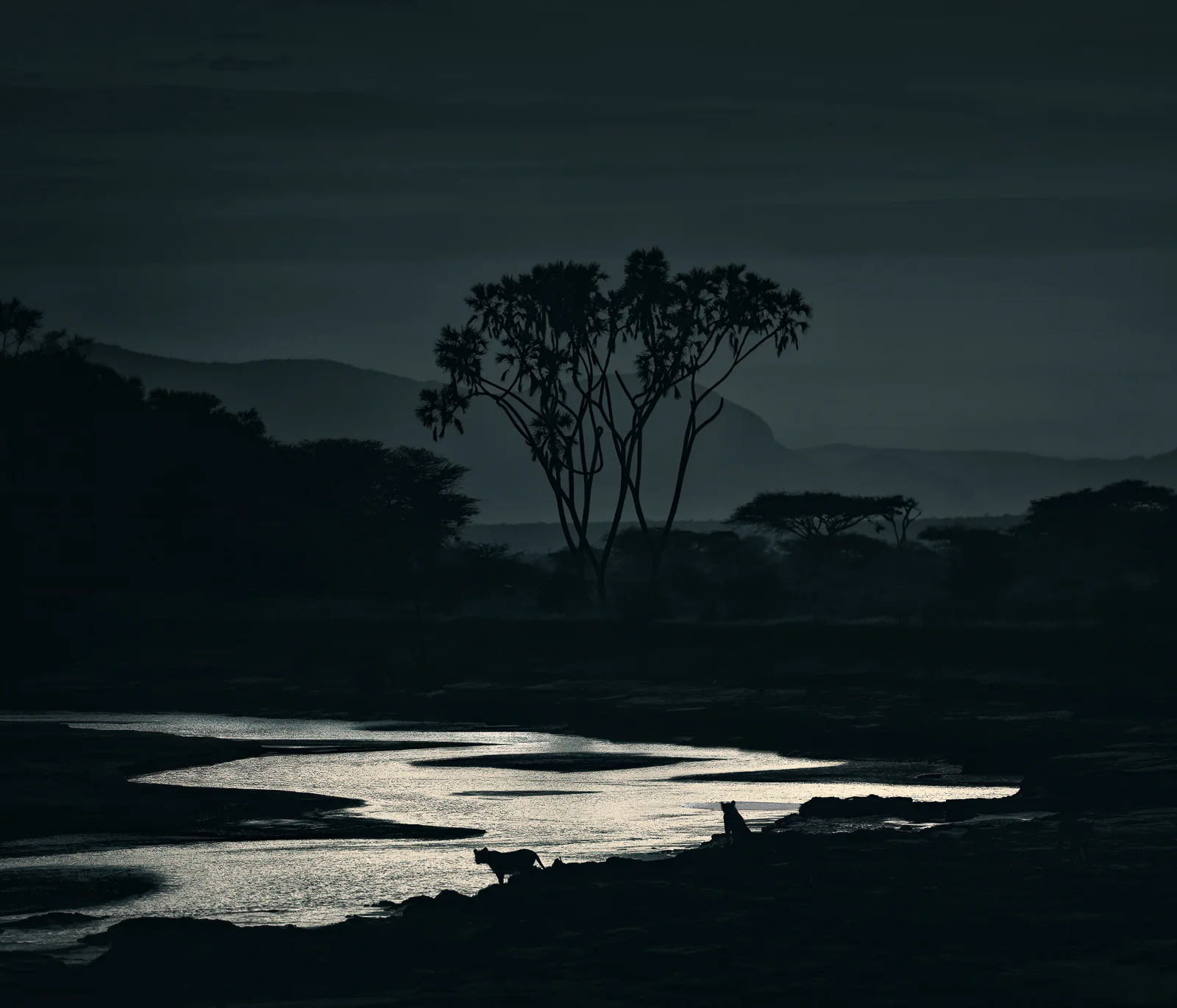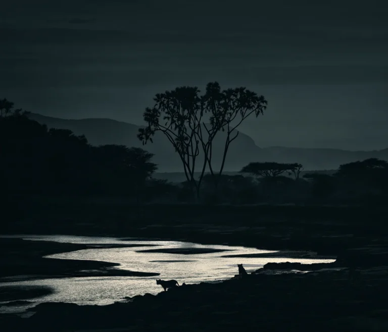 As the sun slipped behind the mountains, a deep stillness settled over the land. The warm air held its breath, and the sky stretched wide above the quiet earth. Hidden in the shadows, the lion pride stirred. Beneath them, the river shimmered, carrying life and silence in equal measure. Nothing moved, yet everything felt awake. The palm tree stood silent — watching, always watching.