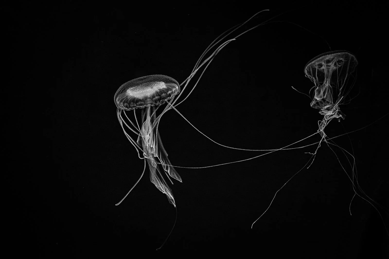 Shot in Kyoto, “Danshingu” captures the ethereal movement of jellyfish — the delicate, pulsing limbs unfurling like a silent dance in the deep. Rendered in black and white, the image abstracts the creatures into something otherworldly: a spirit form, a flicker of motion suspended in darkness. This transformation invites contemplation of fluidity, fragility, and the alien beauty of ocean life. In this work, the jellyfish are both subject and symbol — an emblem of vulnerability and resilience, drifting through unseen currents. “Danshingu” speaks to the poetry of nature’s rhythms, where even the smallest beings carry the grace of a dancer.