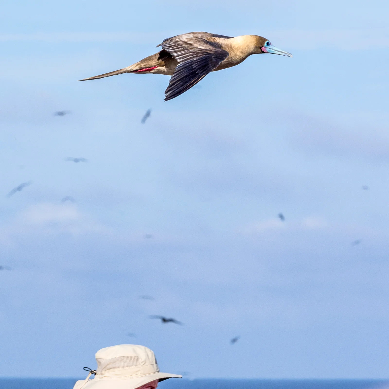 I was watching a red-footed boobie swoop toward me and worked to capture it quickly. The image included the top of a friend’s hat. Genovese Island, Galapagos.