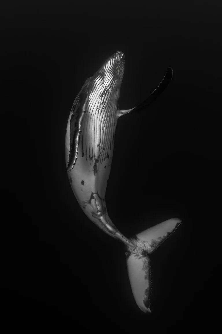 A baby humpback whale performs a joyful ballet in the depths. Captured in the remote waters of the South Pacific, this image isolates a fleeting moment of grace—an infant humpback suspended in open water, mid-pose, as if dancing in the void. The composition embraces negative space and soft light to highlight the form and motion of the whale, drawing focus to its gentle curve and the delicate contrast against the dark sea. Shot during a quiet interaction while freediving, this image reflects the emotional stillness and simplicity found in nature when stripped to its essentials. In black and white, the calf becomes sculptural—an expression of innocence, motion, and the power of presence within emptiness.