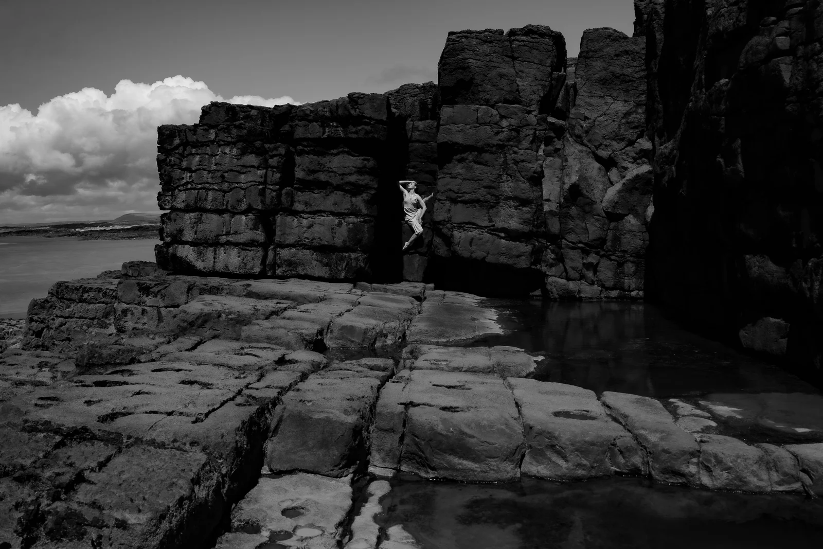 Set against the looming basalt formations of the Welsh coastline, this monochrome image captures a moment of poised tension and vulnerability. Suspended mid-air within a narrow crevice, a Ukrainian dancer — and refugee — embodies the emotional weight of displacement and resilience. Her movement, graceful yet strained, channels the psychological turmoil experienced during the full-scale invasion of her homeland. The towering rock walls, seemingly closing in on either side, echo the claustrophobic uncertainty and isolation of her reality.