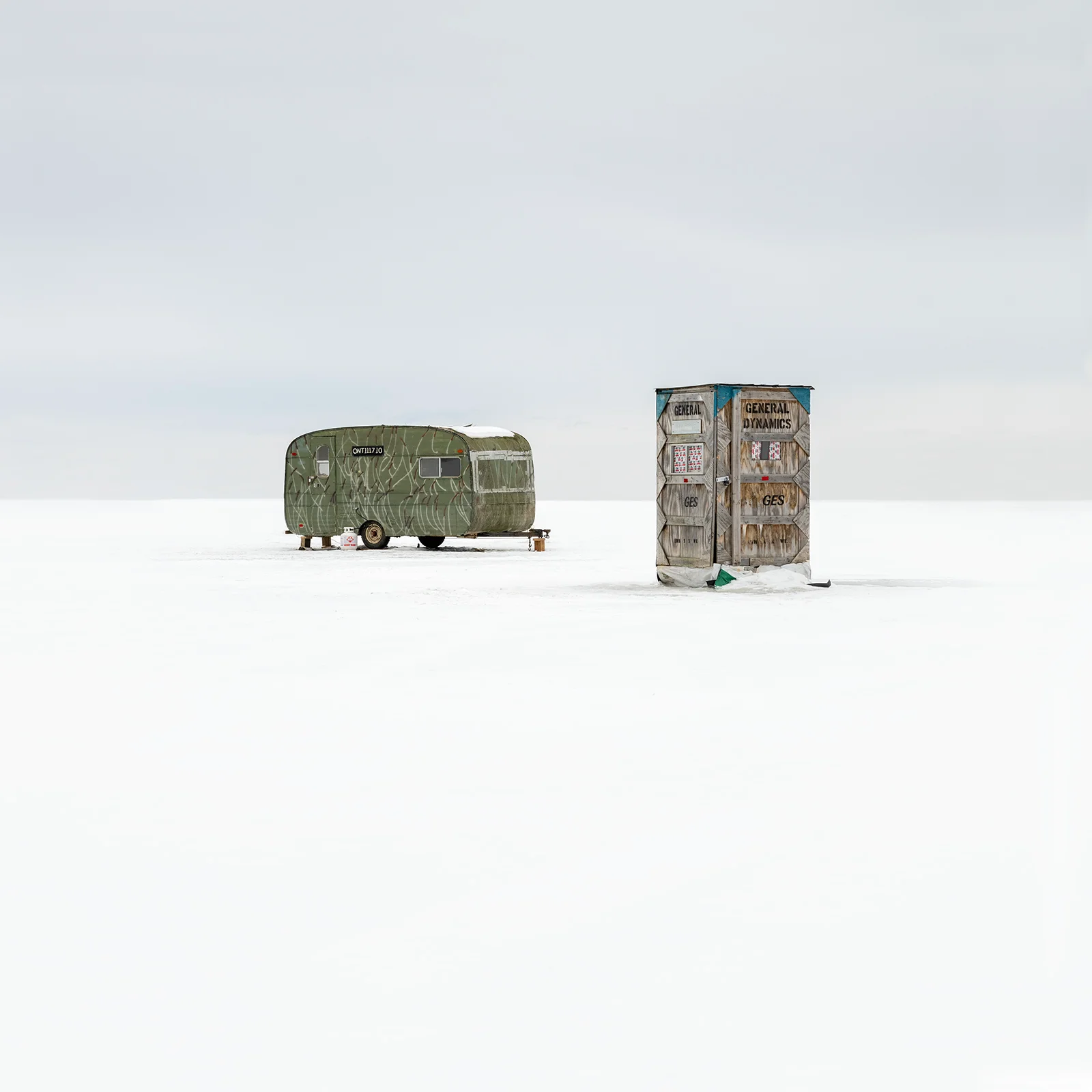 I took this image on the frozen River Ottawa in Ontario, Canada. The local fishermen usually use wooden huts to shelter in while fishing. The odd few utilise old trailers or caravans like this one.