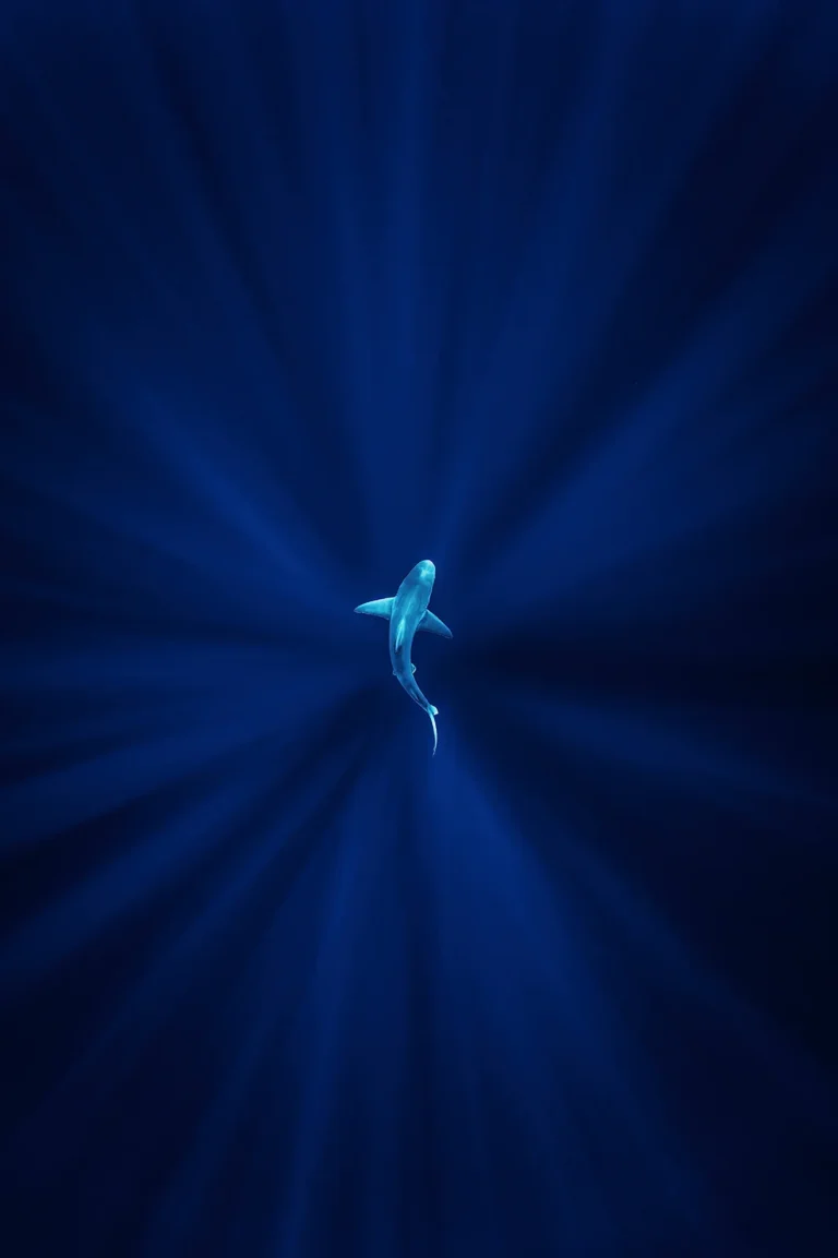 A solitary shark drifts through the deep, illuminated by beams of light that radiate outward like a celestial spotlight. Captured far offshore in the open ocean, this image reduces the scene to its most elemental forms—light, shadow, and motion. The shark becomes a silhouette of serenity and strength, suspended in the vastness. Framed at the heart of a natural mandala of light, the subject draws the viewer inward, inviting stillness and reflection. In a world often portrayed with fear, this photograph seeks to reframe the shark as a symbol of grace, balance, and beauty—reminding us that even in the deepest blue, radiance can be found.