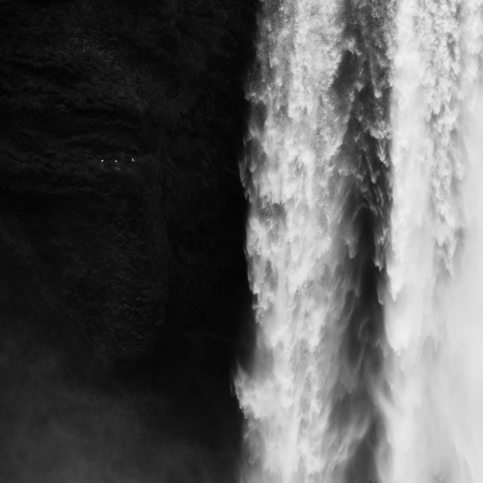 This photograph was taken at Skógafoss waterfall (Iceland) in September 2024. Being at one of the most photographed waterfalls in the world, I tried to add a different perspective. I soon noticed the presence of three seagulls aligned on the rocky wall of the waterfall and focused on them. The light was very flat, but I knew that black and white processing would be very effective in this case, playing with the contrast between the dark rock and the white of the water and the seagulls. The 105 mm maximum focal length of the lens I had mounted was perfect for my intention, as the idea was to create a minimalist composition with the three birds, using them as a scale to appreciate the dimensions of the waterfall. My camera has a 3×2 sensor, but I preferred a square crop, following the 6×6 film camera format to give more presence to the seagulls. The composition, which divides the frame into two halves, doesn’t follow the usual rules, but in my opinion, it works well in this case due to the balance provided by the three seagulls aligned at a third of the top edge. I used a relatively high shutter speed to add dynamism and drama to the scene, which was later enhanced during editing, mainly by increasing the contrast, without losing the details and texture of the rocky wall.