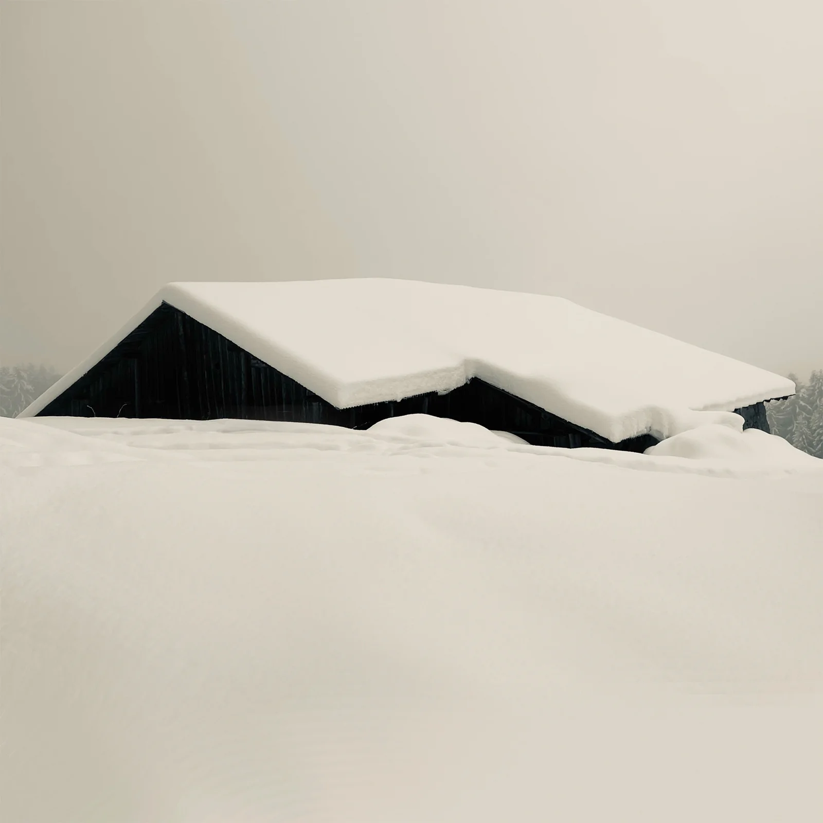This photographic series explores the fragile tension between architecture and nature in alpine winter landscapes. Wooden chalets and rural structures are reduced to minimalist silhouettes, partially buried under snow or fading into the whiteness, often isolated in a vast, silent void. Snow acts as both an eraser and a sculptor — softening lines, erasing context, and revealing essential geometry. In the background, a subtle sense of absence lingers: that of a landscape changing, of winters growing lighter. These images invite contemplation on stillness, solitude, and the quiet resilience of built forms facing time, erosion, and impermanence.
