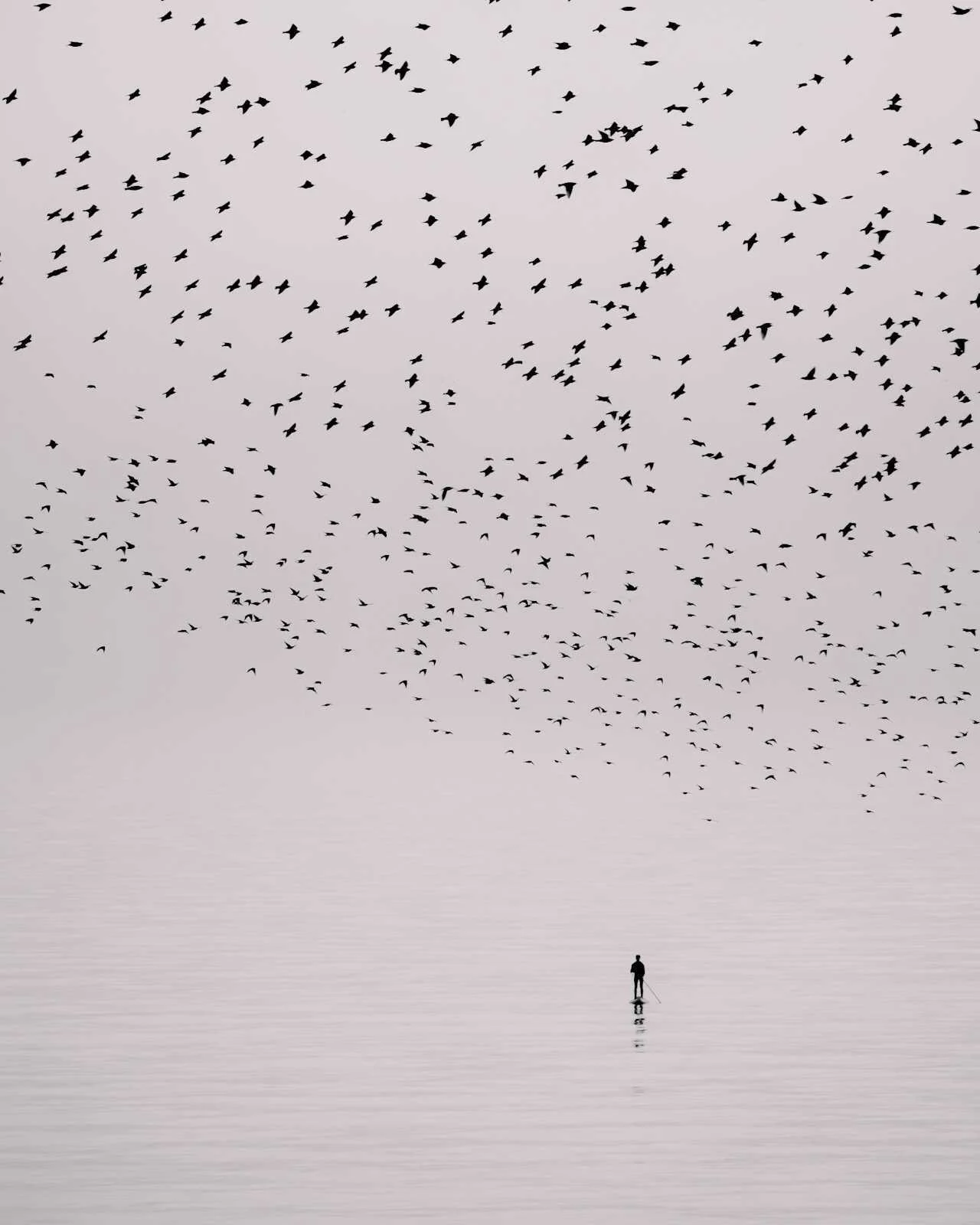 Street photography in Brighton often involves capturing seaside moments; this photo captures the magic of the annual starling murmurations as they swarm around the Palace Pier, flying over a lone paddle-boarder on a day the sea was so still and calm it was almost like looking out over a gigantic lake.