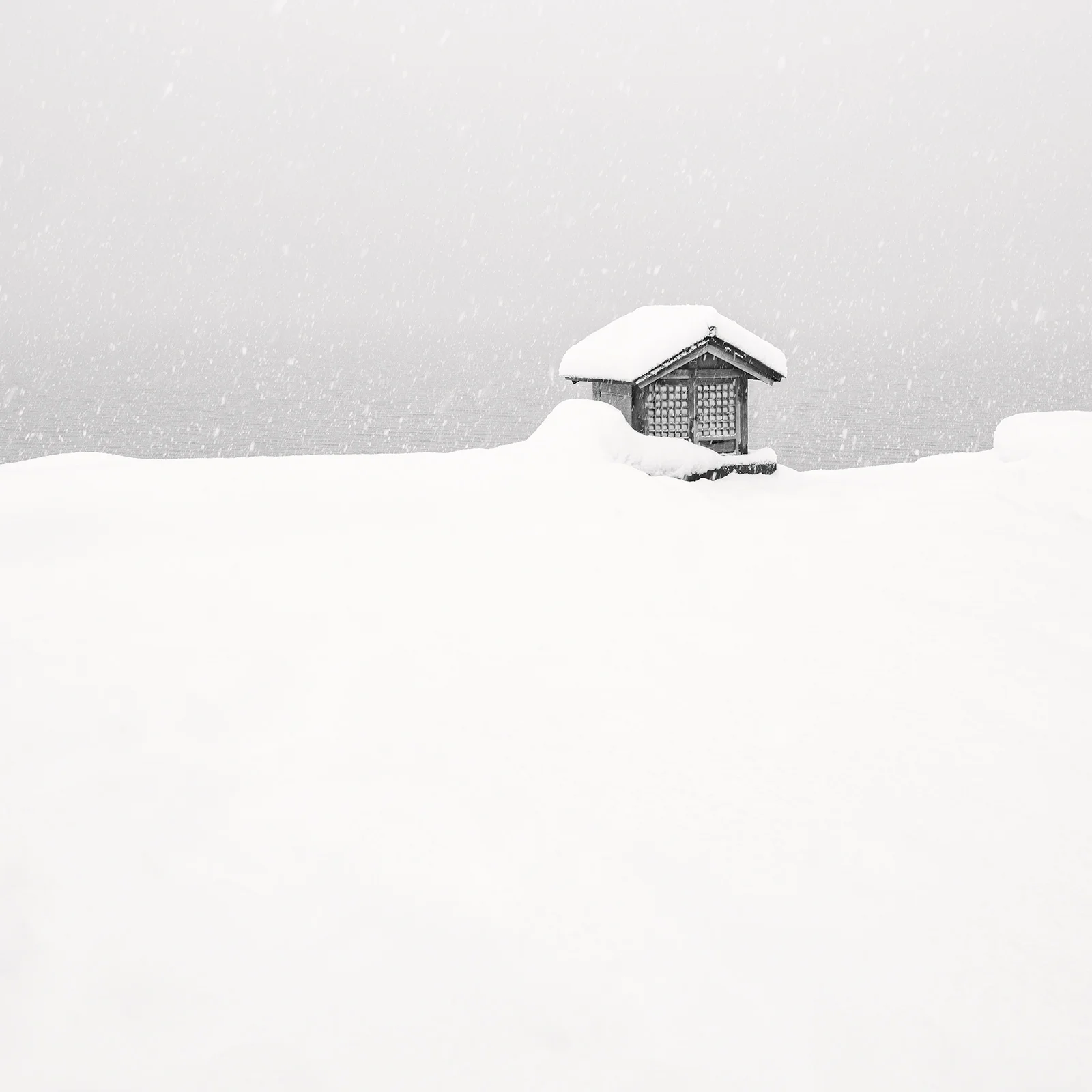 I spent a couple of weeks on Lake Biwa in Japan in February 2025 when a snow storm blew in from the East. Each day I would travel up the Western shore of the lake photographing an ever increasing snowy landscape. People would relentlessly come out of their houses to sweep away the snow every morning only to wake up the next day to discover yet another 6 inches had fallen over night. This little house in Takashima managed to escape their shovels and so became more and more immersed under a blanket of snow as the days passed.