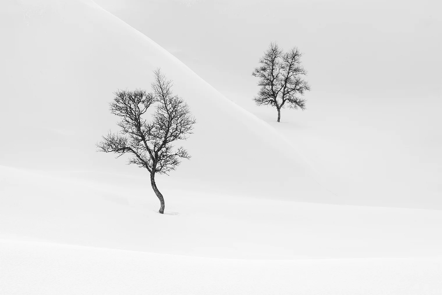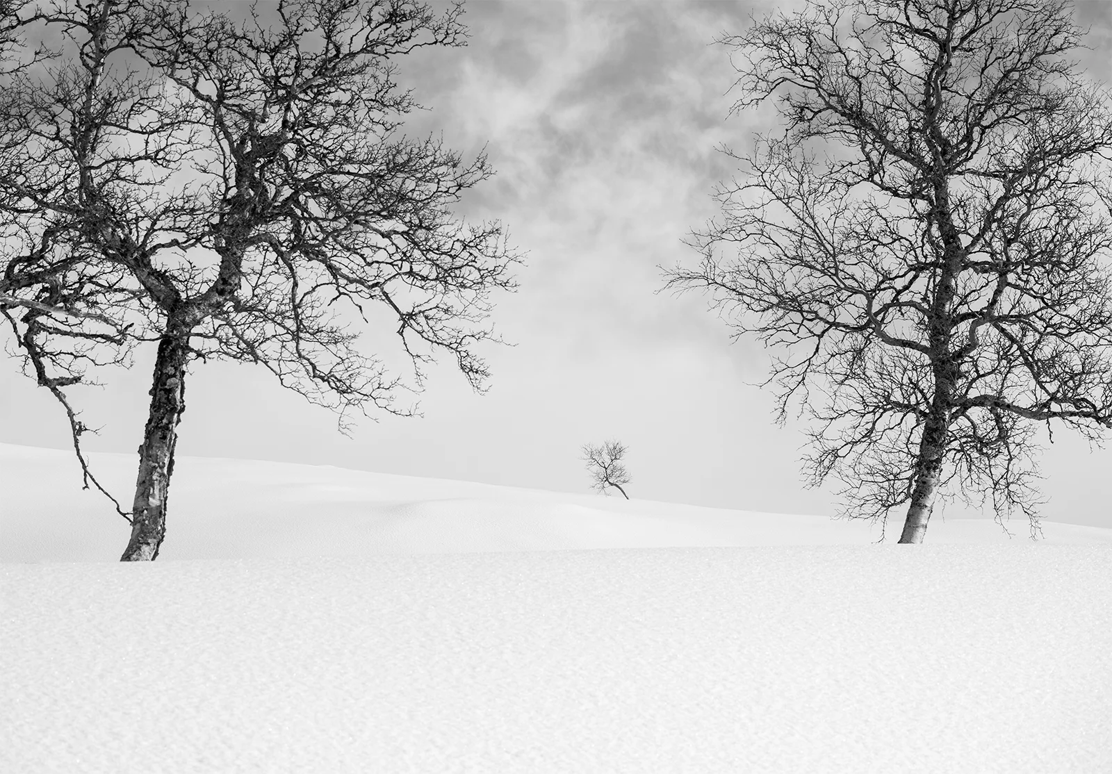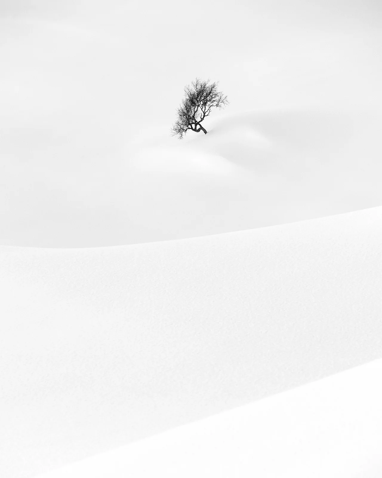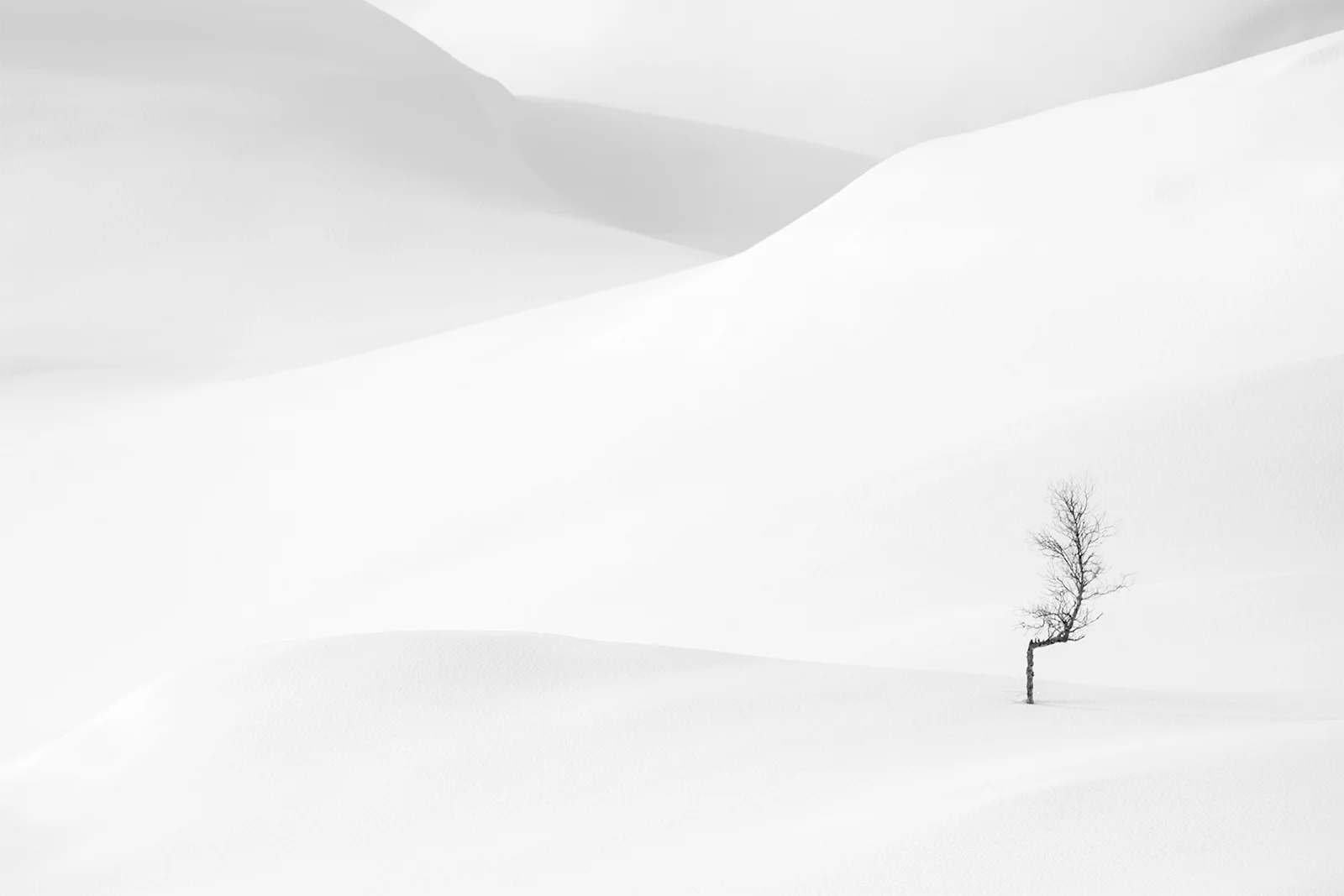 This series is a visual meditation on silence and solitude in the winter landscapes of Telemark – a mountainous region in southern Norway. Captured in the deep snow of midwinter, these scenes portray the poetic resilience of lone birch trees, shaped by weather and time, standing quietly in vast open whiteness. Each frame is an exploration of space, rhythm, and negative form – where light becomes sculpture and the absence of color reveals the essence of place.