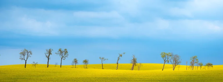 A row of trees quietly marks the presence of a hidden road, cutting through a blooming field of rapeseed in rural Poland.