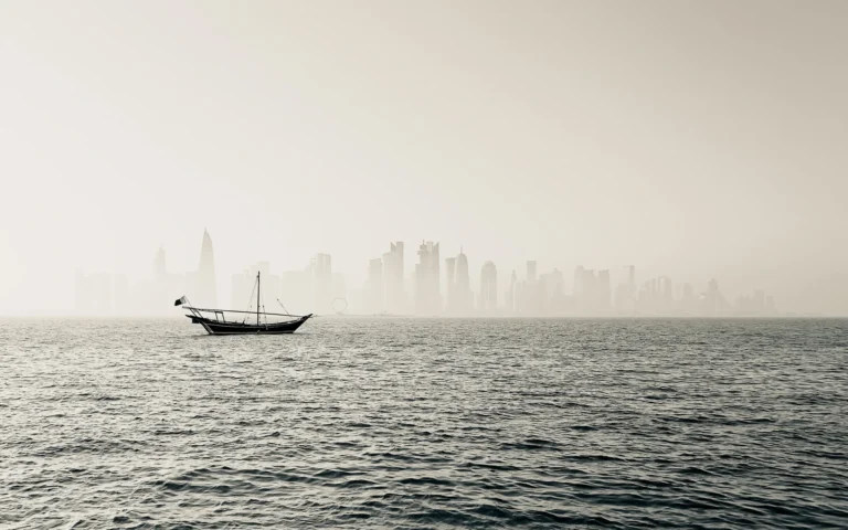 Doha sailing boat set against the modern city skyscrapers rising out of the sea mist