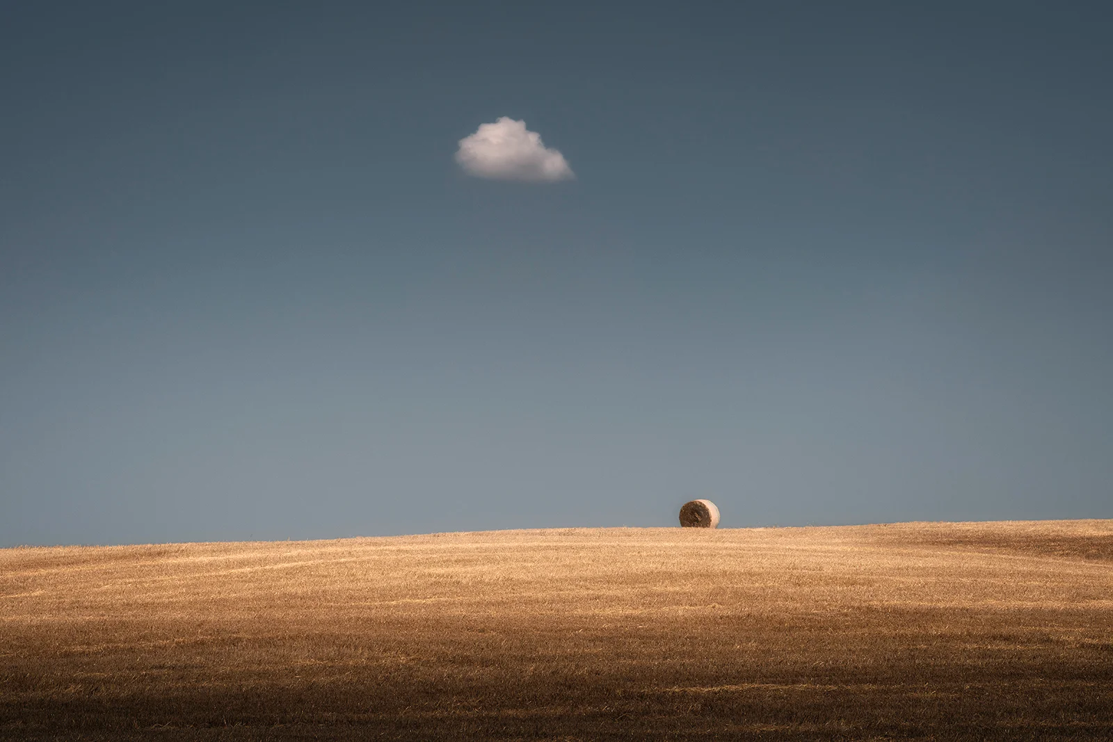In a boundless expanse, a lone hay bale stands as a quiet witness to time’s passage—anchored, yet ephemeral. Above, a single cloud drifts, echoing the impossibility of stillness in a world that never ceases to move. This image explores the tension between permanence and impermanence, presence and absence—inviting the viewer to confront the melancholy beauty of transience.