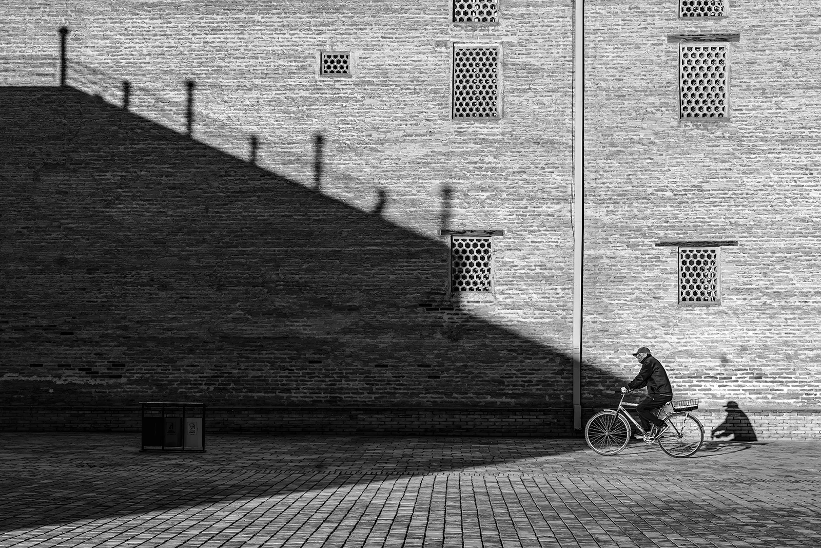 The rigid texture of the brick, the symmetry of the window grates, and the delicate balance between light and void emphasize the quiet resilience of everyday life.