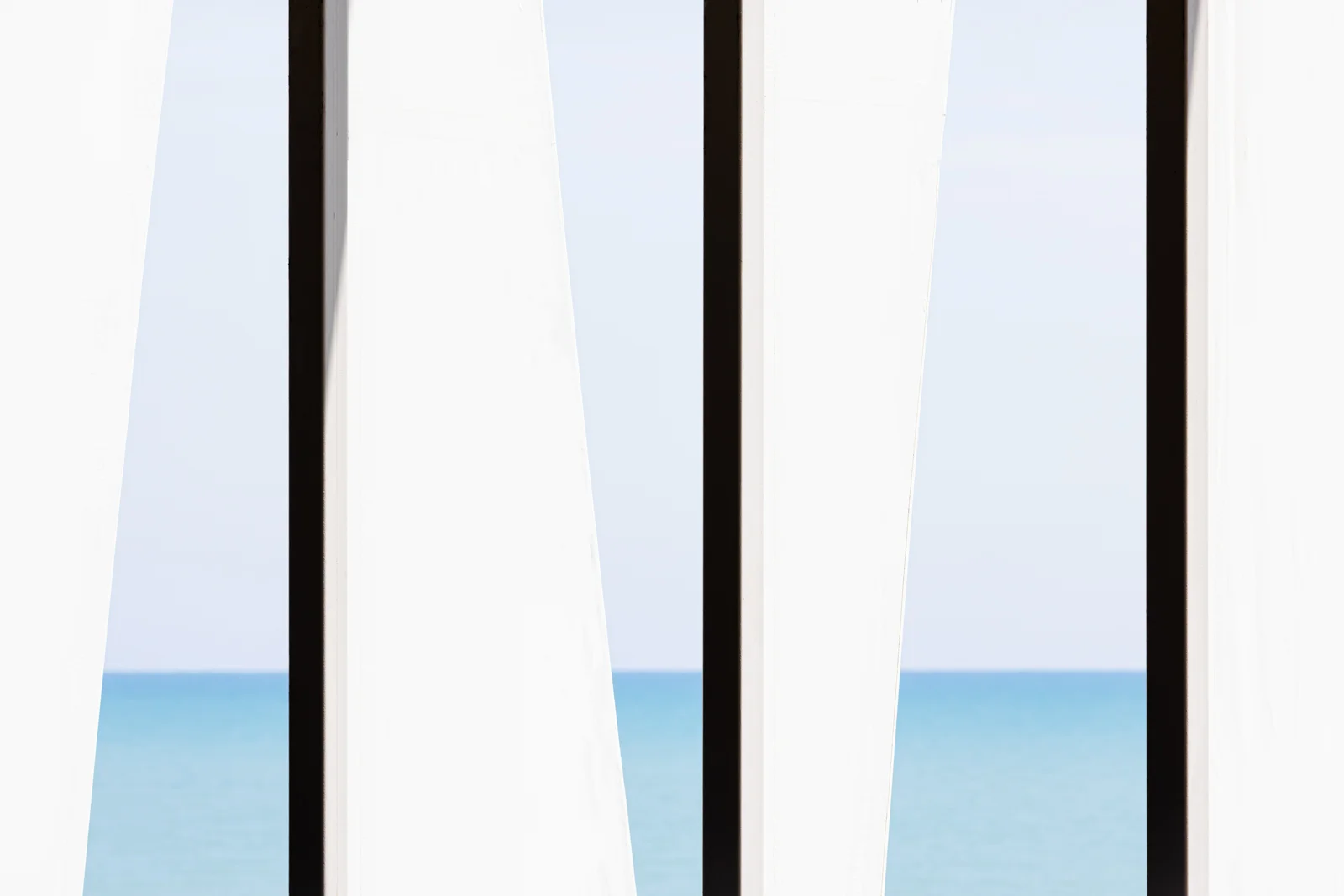 Getting out of my car in the parking garage at Northwestern University, a minimalist art deco-like scene caught my eye, formed by the pillars of the garage with a crystalline Lake Michigan showing through.